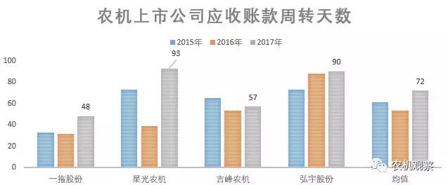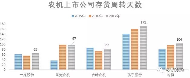 其次,主要运营指标全面恶化。除去中联重科和新研股份(农机占总体营收比例过小,未单独披露农机相关指标),其余4家公司的经营现金流净额、应收账款周转天数、存货周转天数等主要运营指标的2015-2017年均值数分别为1.22亿、5.96亿、-1.22亿和61天、53天、72天以及82天、97天、104天。主要运营指标的恶化,提醒农机行业人士要充分关注上下游的债权债务风险,也体现了行业下行压力下各家普遍在主动或被动的放松了信用政策。然而,即使这样,也没止住营收下滑的势头,真是难啊。另外,从农机产业链角度看也蛮有意思,吉峰农机经营现金流净额连续增长(-0.5亿、1.4亿、1.5亿),弘宇股份下滑较缓(0.5亿、0.4亿、0.2亿),而两家主机厂的“失血”速度就快的多(一拖股份从16年的20.9亿到17年的-5.6亿,星光农机从16年的1.1亿到17年的-1.1亿),虽然样本量小了点,但也不难看出,经销商和供应商的主动权更大些,主机厂则仍需硬着头皮搞铺货占市场。