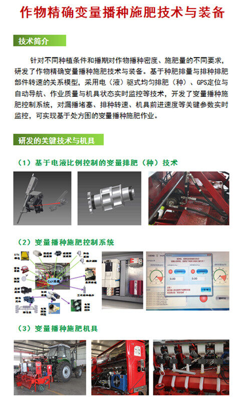 现场观摩会重点演示了我所最新研制的“精确变量播种施肥机”,该装备具有播量模型在线标定功能,可实现不同品种、不同类型种子、肥料的播量模型实时标定,增加了播种施肥装备的通用性;研发基于电控的液压驱动系统,利用拖拉机通用的液压输出端口,可满足大型机具的作业功能多样化对拖拉机多路动力输出的需求,液压系统输出功率可满足大功率、快速响应的动力需求,有效解决现有电机驱动方式播量调整范围小,适应性差的难题;同时该装备具有漏播、堵塞实时监测、RTK-GPS动态定位、CAN总线控制、网络通讯协议等特点,机手在驾驶室可实时接收作业地块的播种施肥处方图,结合研制的自动辅助驾驶系统,可实现播种施肥作业的“一键化”操作。该装备的现场演示受到了观摩领导、专家及种植大户、农机手等的一致好评,相关专家一致认为:该技术前沿,内涵丰富,充分体现了以智能装备为载体、以信息化为特征的优势,代表了未来规模化、信息化、智慧化的现代农业发展方向,试验与示范一体化实施的创新模式,更有利于项目成果的落地转化应用。