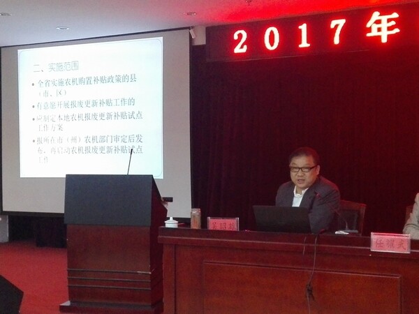 为实施好农机报废更新补贴工作,3月30日,省农机局在襄阳市谷城县举办了2017年全省农机报废更新政策培训班,全省各市州以及部分开展农机报废更新补贴工作的县(市、区)农机部门相关负责同志参加此次培训。省农机局副局长皮少成同志参加培训并讲话。省农机局产业发展处处长付汉强同志、质量管理处处长陶保平同志、省农机安全监理(推广)总站站长任耀武同志参加了此次培训活动。农业部农机试验鉴定总站副处长田金明同志专程为此次培训班授课。