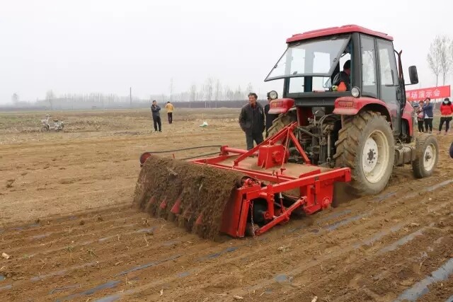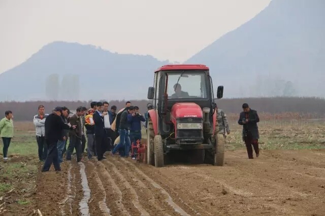 清明刚过,谷雨未至。微凉的清晨,田地里的泥土还泛着微微的湿润,众多观摩人员刚走到田间地头,就看到三五农民在已经翻整松软的土地里均匀地撒攘着化肥,随后配套着210型水稻旱直播覆膜机的黄金海马-750拖拉机开到地头儿,两位助手将已经粘籽的地膜摆放好位置,机器一动,铺好地膜的部分随之被土压实,高效便捷的水稻旱作覆膜播种过程就完成了。