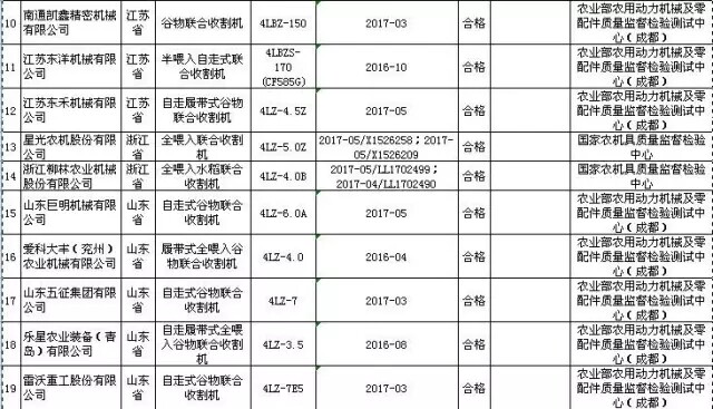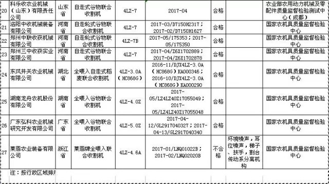 据了解,2017年第2批,共抽查了吉林、黑龙江、江苏、浙江、山东、河南、湖北、湖南、广东等9个省27家企业生产的27批次稻麦联合收割机产品。抽查企业数占全国此类产品生产企业总数的49.1%,抽样产品合格率为96.3%。