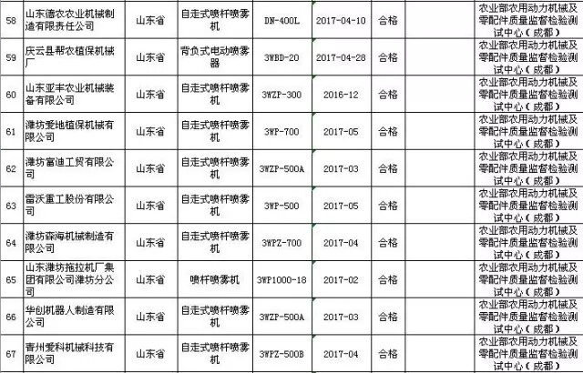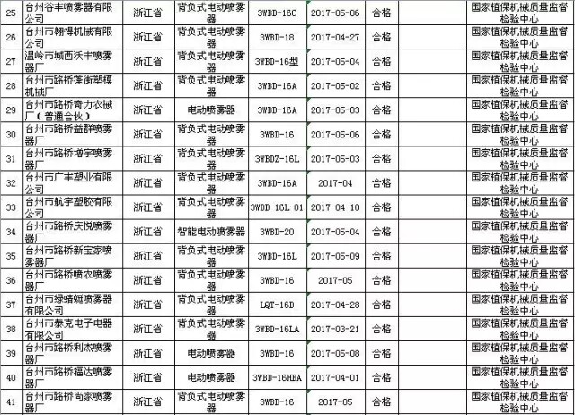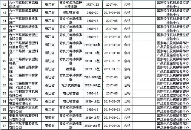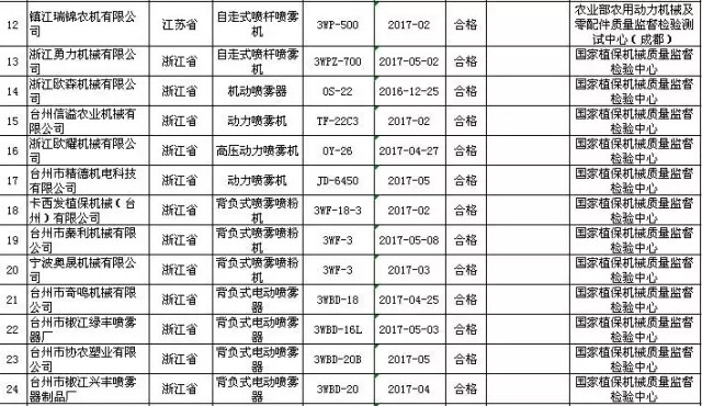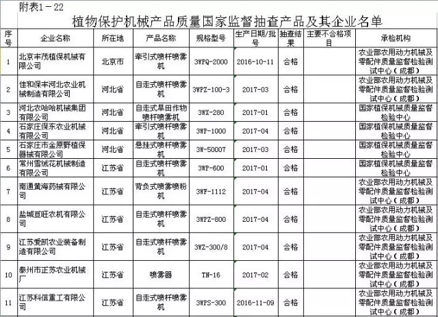 2017年第2批,共抽查了北京、河北、江苏、浙江、安徽、山东、河南、湖北、广东、广西、四川、云南等12个省、自治区、直辖市100家企业生产的100批次植物保护机械产品。抽查企业合格率和产品合格率均为97%。