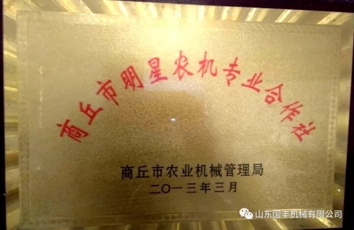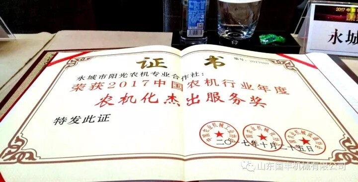 2017年10月25日,永城市阳光农机专业合作社凭借15万亩的作业面积,荣获“2017中国农机行业年度农机化杰出服务奖”,再次成为农机化服务的行业标兵!阳光农机专业合作社位于河南省永城市蒋口镇,成立于2009年,拥有各型机具近百台套,是商丘地区规模效益屈指可数的优秀合作社,先后荣获:全国农机合作示范社、河南省农机合作社示范社和商丘市明星农机专业合作社等荣誉称号。