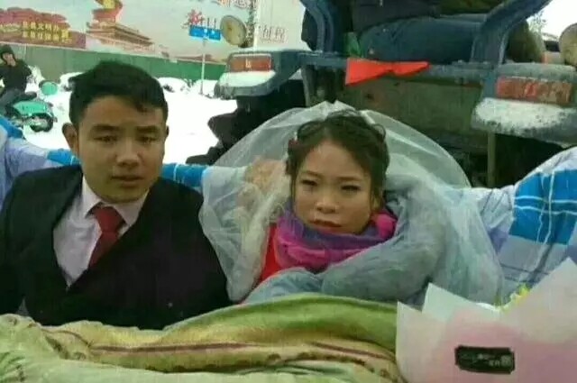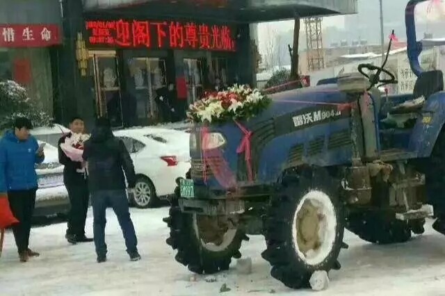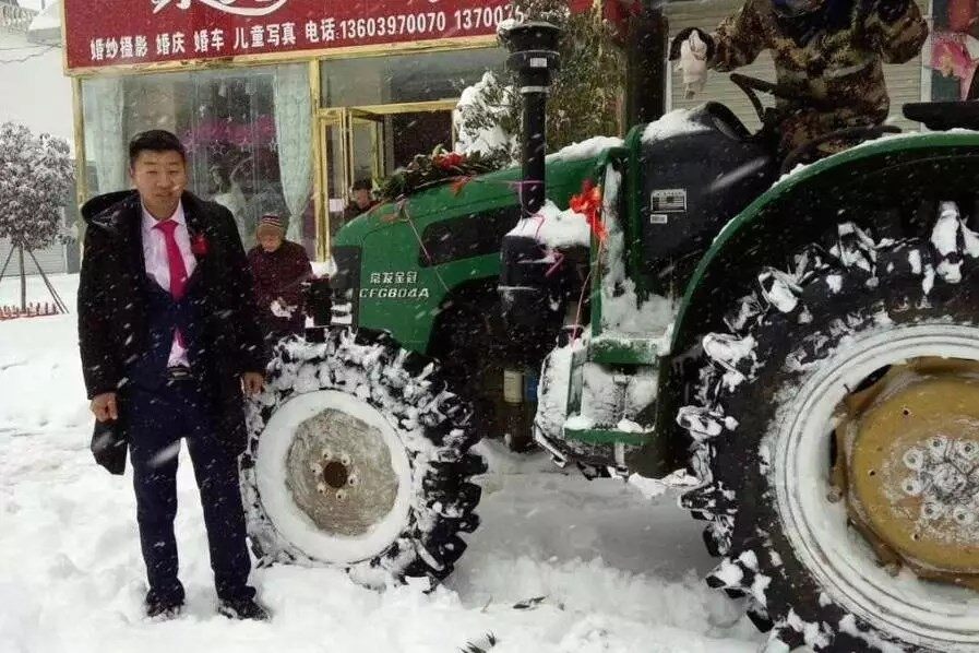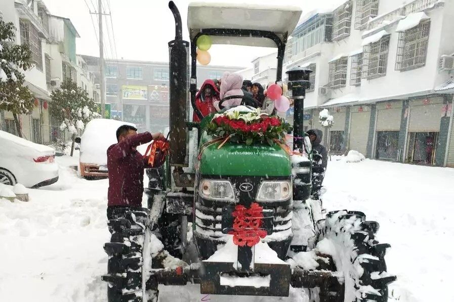 1月4日,农历冬月十八,黄道吉日,受暴雪影响,河南信阳路面积雪湿滑,普通汽车无法行驶,新郎急中生智,改用拖拉机当婚车,迎娶新娘。