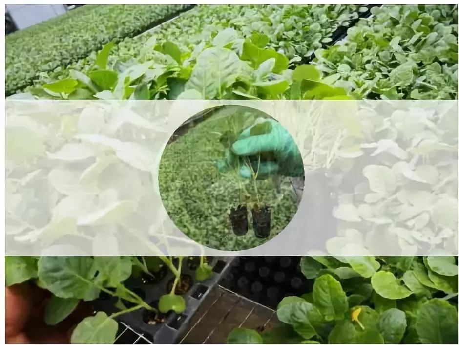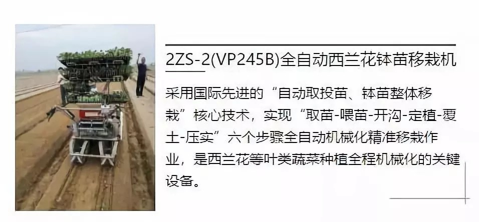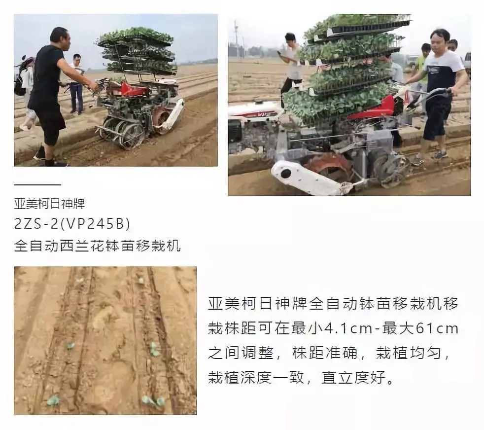 本次使用的是亚美柯公司研发生产的西兰花全自动二行钵苗移栽机,所用秧苗是由亚美柯公司生产的全自动播种流水线和专用220穴秧盘在育苗大棚培育生产,本次种植的西兰花品种为板田耐寒优秀炎秀,每亩使用12-13张盘,植苗2600-2800株,一台机子每天作业30亩,可抵15个人工,大大节省劳力,生产效率大幅提高。