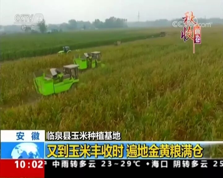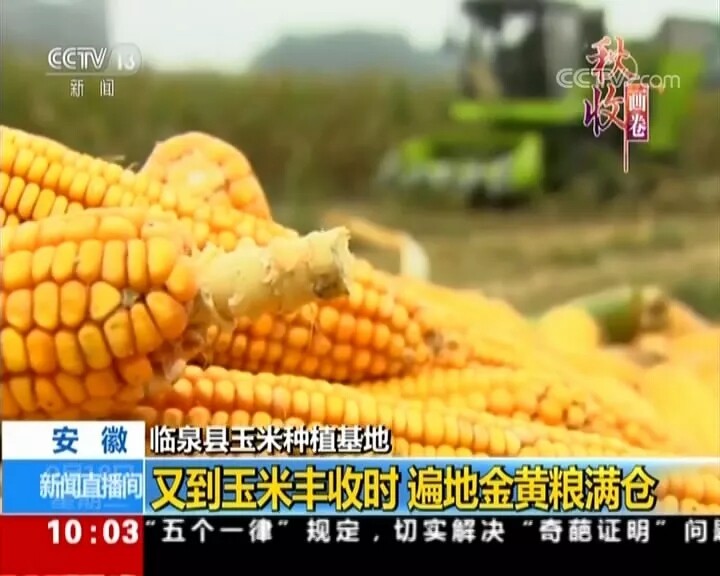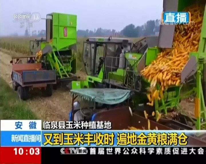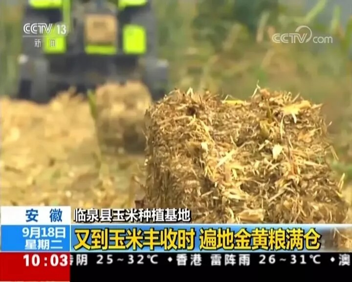 央视新闻频道《新闻直播间》9月18日报道:您现在看到的是安徽临泉县的玉米种植基地,119万亩的玉米地又迎来丰收。大家看到的这台绿色的机器就是玉米收获机,能一次性完成玉米的摘穗和脱皮,而一旁的秸秆打捆机会把玉米秸秆打成包,这些秸秆包将会运往饲料厂等地,每亩地因此也会增加六七十元的收入。