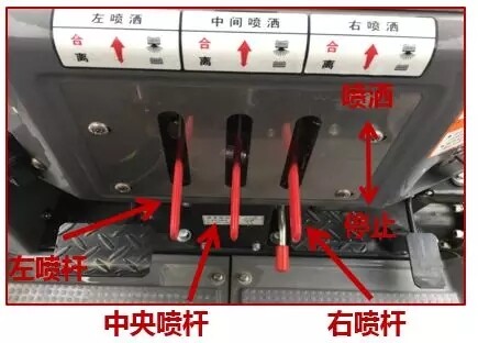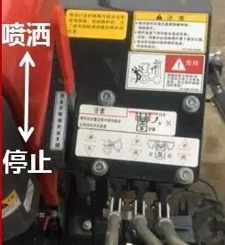 3.吸水过滤器排水开关切换到喷洒位置,高压过滤器排水阀切换到关闭,向药液箱内注入 100L清水,药液泵切换到开启位置,打开主喷洒手柄和喷杆离合手柄,从喷嘴中喷出清水以清洗配管内部。